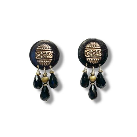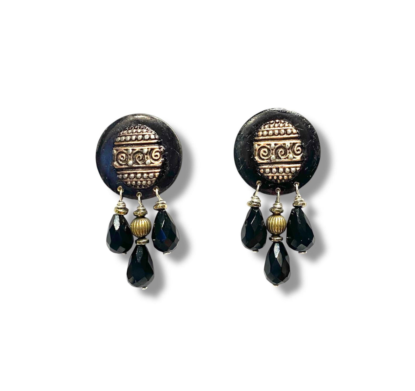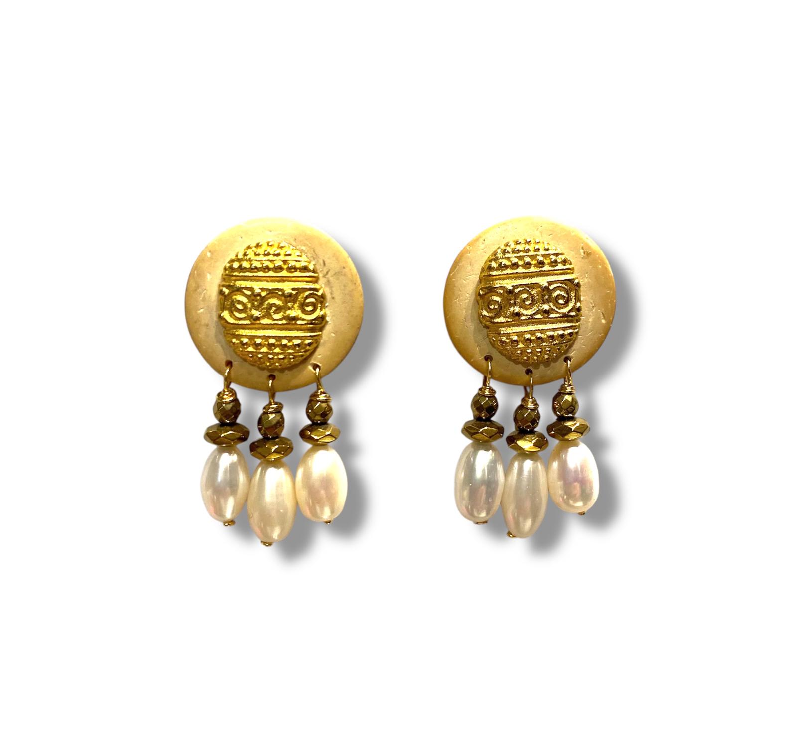 Inspirées des parures tribales ces boucles d’oreilles allient or gravé, perles de couleur et matières naturelles comme la racine de palmier ou l’hématite.