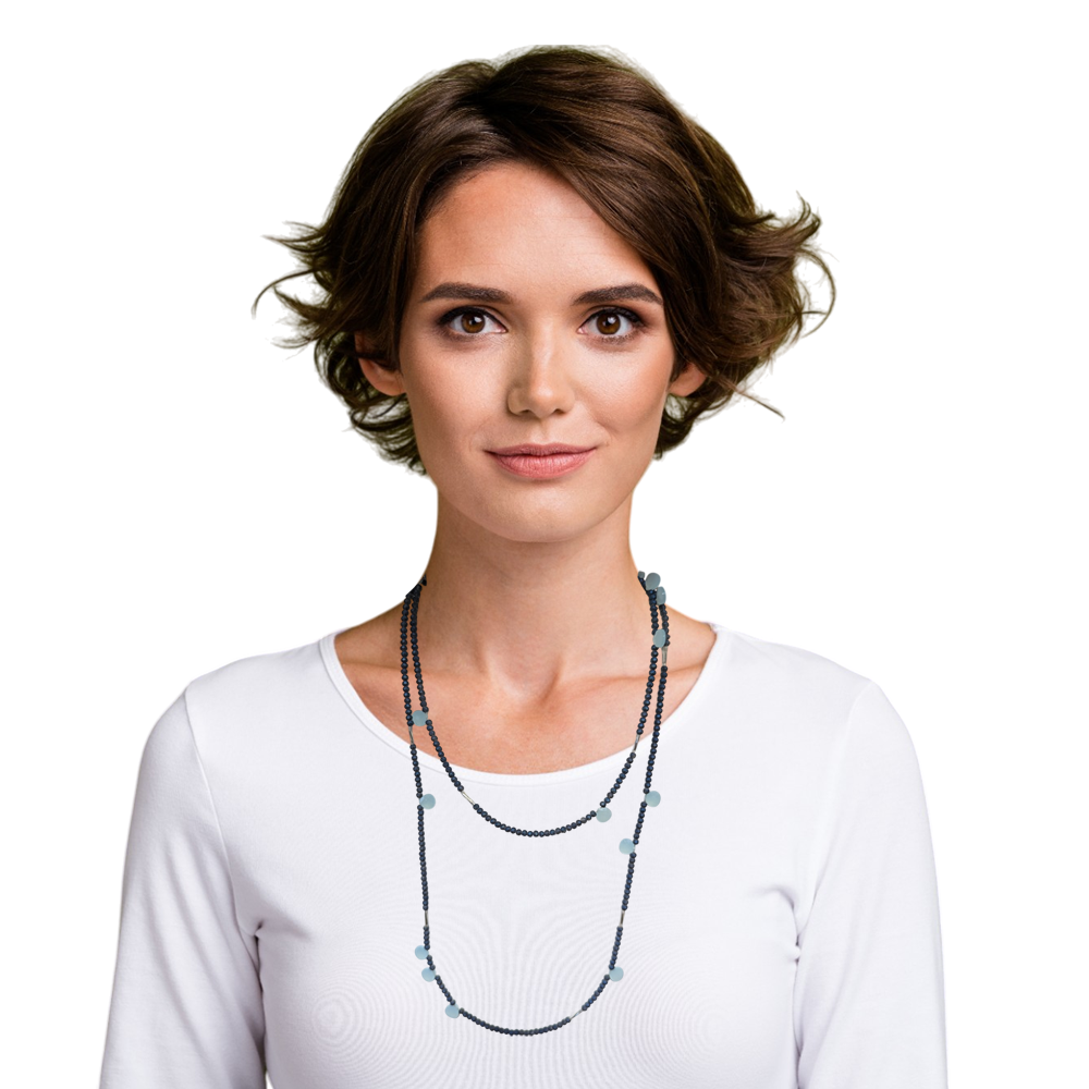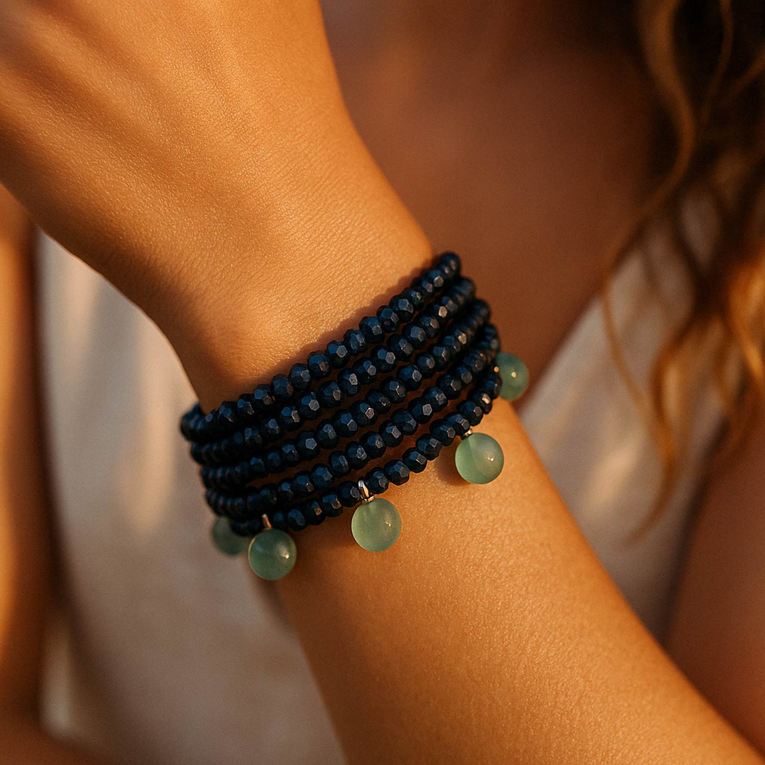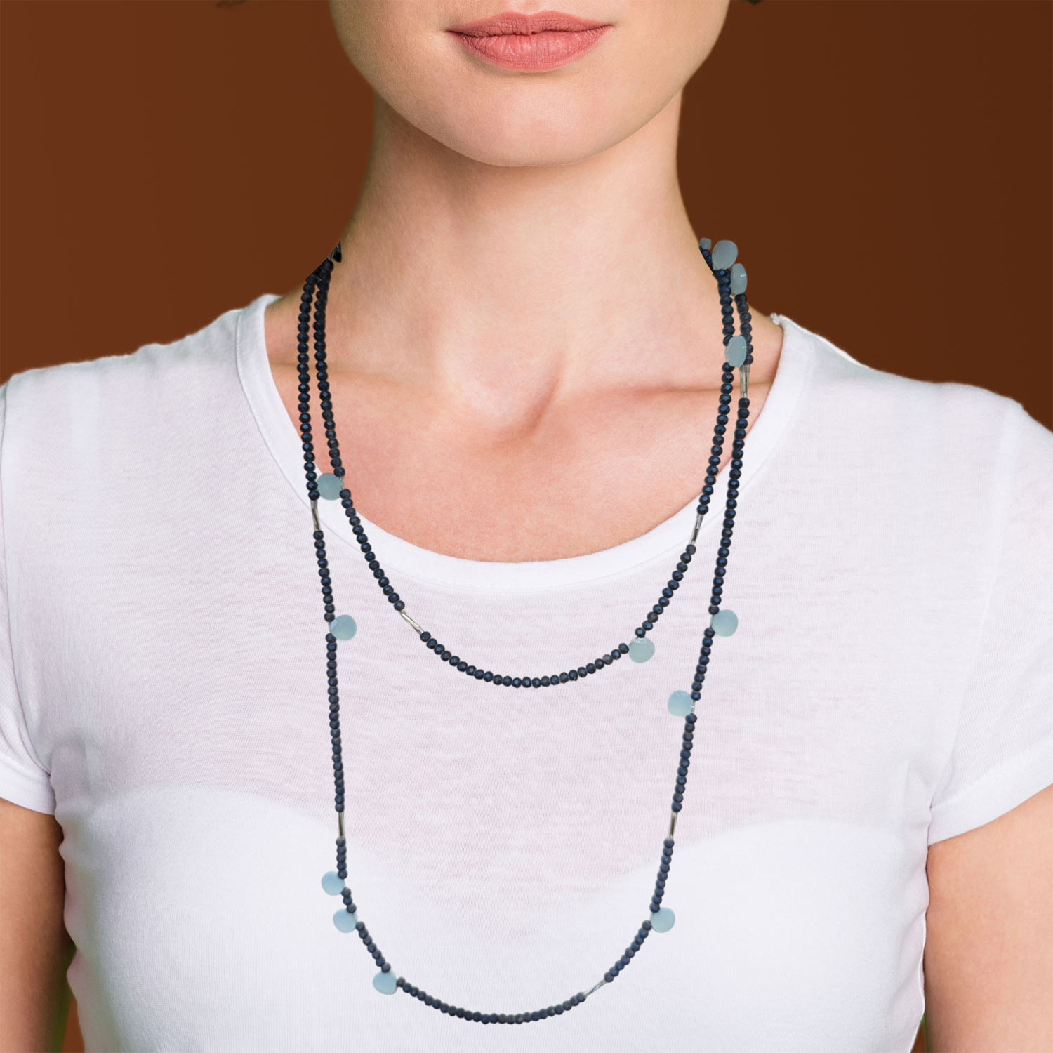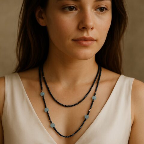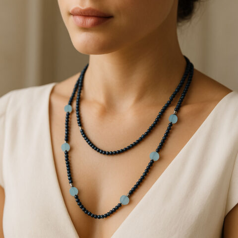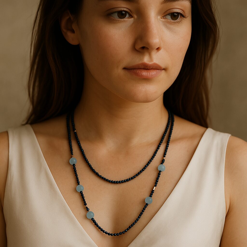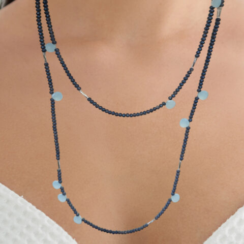 Évoquant la rencontre entre l’infini du ciel et l’onde marine ce bijou incarne la liberté et l’élégance nomade. Son enfilage de perles bleu nuit scintillantes, entrecoupé de touches laiteuses translucides, rappelle les vagues qui se brisent sous un clair de lune.