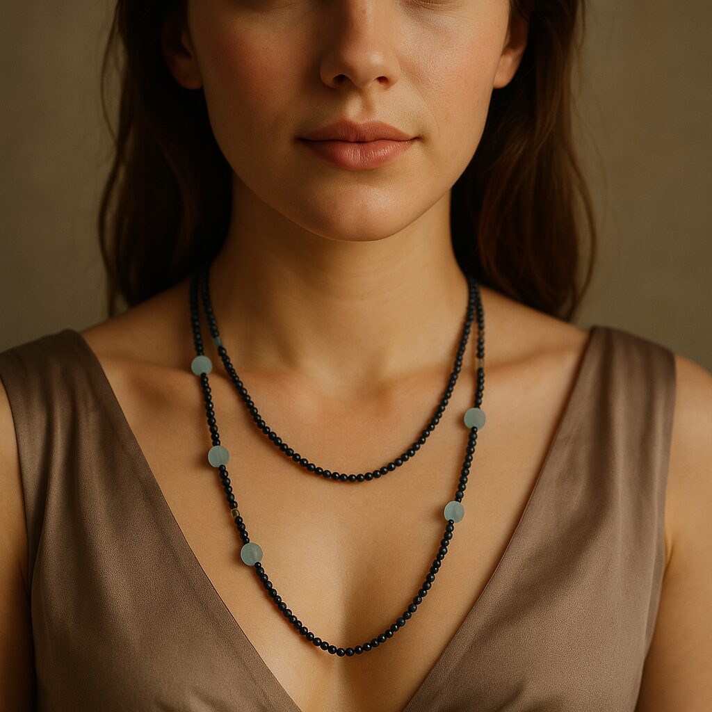 D’une adaptabilité rare, il peut se porter en collier long ou s’enrouler autour du poignet pour devenir un bracelet multi-tours.